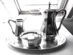 Service à café ancien composé d'une cafetière, d'un pot à lait, d'un sucrier et d'un plat de service. Le plateau e