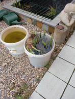 Grote emmer vol gele lis planten