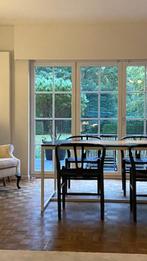 Eigentijdse eettafel met massief eiken blad en wit metalen onderstel. Afmeting: 110x245 dikte massief eiken blad: 2cm dikte metaal