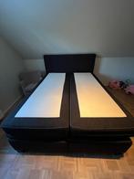 Merk: revor kleur: navy blauw totale afmetingen matrassen: 200 x 160cm extra toplaag - soft hoofdbord 10cm zwarte houten poten bed