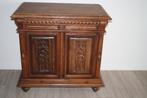Mechelse eiken onderkast met schuif en 1 legplank. In de schuif zijn er nog 2 schuifjes. De panelen in de deuren zijn uitgewerkt , een man en een vrouw , gotische stijl. Lengte : 93 cm , diepte : 53 c