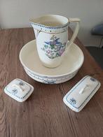 Dit betreft een art deco toilettafelset van boch la louvière, model 'volga', vervaardigd in belgië. De set bestaat uit een waskom, waterkan, z