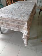 Tafelkleed met mooi dessin. Zeer grote afmeting : 2,70 cm x 2,20 cm. 100% Katoen, kleuren : blauw, beige en bruin.