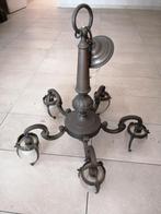Antieke messing hanglamp / luster – 5 armen – ca. Jaren 1935–1955 zeer mooie antieke luster in messing of bronskleurig gietijzer, met vijf glazen kelken in mat amber/wit glas. De lamp heeft sierlijke