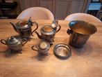 Vintage ekegant koffie/thee service. "hotelzilver" 6 delig. Koffie, thee , melk kan, suikerpot, schoteltje, wijnkoeler. De stukken zijn versierd met gegraveerde patronen rondom de buik van d