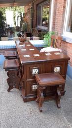 Prachtige complete bar/toog met bijpassende krukken, handgemaakt door mades. Stempel is duidelijk aanwezig en bevestigt de ambacht