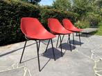 Set van 3 vintage pierre guariche stoelen. Model coquillage (schelp) voor meurop. Kleur rood en zwarte metalen poten. Normale gebruikssporen conform de leeftijd. Ontwerp van jaren 60. 1 Stoel mist een