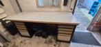 Zeer stevige werkbank te koop metalen schuiven kunnen gewicht aan. Aangename hoogte om zowel zittend als staand te werken werkblad is 4cm dik (hout) 200cm breedt en 75cm diep werkbank is 86cm hoog lie