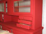 Buffet de cuisine style mado, datant des années 1940-1950, composé de 2 parties, relooké en rouge, intérieur à finaliser, en parfait état.