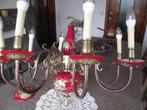 Lustre 8 branches en cuivre, lampe-bougie, opaline rouge et doré plus décors.