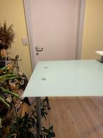 Bureau met zwaar blad uit melkglas, op metalen onderstel en verplaatsbaar verhoogje. Verstelbaar in hoogte (zittend of staand werk