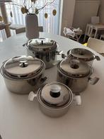 Set van 5 kookpotten van het topmerk demeyere. Is van een serie uit begin jaren 90. Veelgebruikt, maar zeker nog in degelijke staat (zie foto’s). Niet geschikt voor inductiekookplaat. Mag weg wegens n