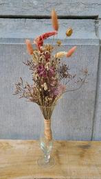 Set van 7 kleine vaasjes (+/-15cm) met droogbloemen in allerlei kleuren. Samengesteld als decoratie voor een huwelijksfeest. Alle