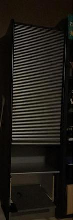 Donkergrijze, redelijk zware kast. Onderaan moet er een deurtje nog terug worden vastgemaakt. Zonder inhoud
