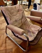 Twee retro mid-century moderne lounge stoelen met buisframe en een ribfluwelen kussen. De kussens kunnen er af gehaald worden om te wassen. Het frame