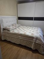 Joli lit double de 1,60 × 2,00 m. Le lit dispose d'un espace de rangement sous le lit : le fond peut être ouvert, idéal pour ranger des objets. En bon état. Seule une déchirure sur le côté (voir p