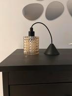 Mooie en sfeervolle hanglamp met een elegante uitstraling. De lamp heeft een cilindervormige kap van amberkleurig glas met een decoratief reliëfpatroon, wat zorgt voor een warm en gezellig lichteffect