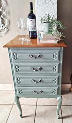 Elegant vintage ladekastje in zachte saliegroene tint met warm houten blad. Voorzien van vier ruime lades en verfijnde details op de fronten en pootjes. Perfect als nachtkastje, halmeubel of accentstu