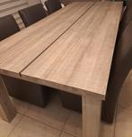 Tafel in goede staat, behalve 1 x schade aan tafelpoot (zie foto 5). Tafel: 2m30 lang em 1m02 breed. Stond altijd afgedekt met tafellaken. Is reeds gedemonteerd. 6 Stoelen reeds verkocht weg wegens aa