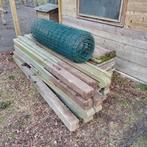 Lengte palen: ca. 230 Cm breedte palen: ca. 11 Cm lengte platen: ca. 192 Cm (13 stuks) en ca. 171 Cm (1 stuk) hoogte platen: ca. 40 Cm lengte draad: ca. 15 M hoogte draad: ca. 122 Cm