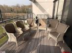 Een houten tuintafel en 6 wicker stoelen met bijhorende kussens nieuwprijs van de stoelen het stuk was 234€ ( x6 ) ! Stoelen zijn nog 👍🏻 de tafel is nog oké maar aan 1 zijkant is de balk gesple