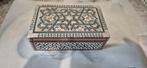 Boîte à bijoux en bois incrusté de nacre, décor en mosaïque d’inspiration moyen-orientale, intérieur en velours rouge. Matériaux : bois, velours, nacre, charnières en métal, finitions laquées. Dimensi