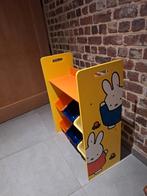 Speelgoed rek met tekening van nijntje. 6 Pastic bakjes in 3 kleuren: blauw, oranje, geel. Bakjes hebben gebruiksporen maar zijn heel stevig. Hoogte: 80cm (zijkanten) breedte: 62,5cm diepte: 30cm 6 ba