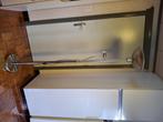 Buffetkast met verlichting binnen, glazen letsels. Tv kast met gesloten kasten onderaan, tafel van 2m met 6 stoelen met grijs stoffen kussens. Lichtgrijze meubels.