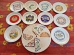 Service à fromages décoré, fond blanc cassé avec inscriptions multicolores, comportant : - 1 plateau à fromages rond, avec poignée dévissable, diam