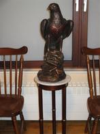 Oud beeld van een loerende adelaar in soort gips zittend op een rots zeer mooi en geen beschadigingen hoogte 60 cm gewicht 17 kg tesamen met tafeltje