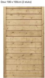 2x tuindeur 180hx100cm breed 6x palen (12/12/270cm), type en aantal in foto (rood) 6x grondankers 1x schutting 180x180cm 1x schut