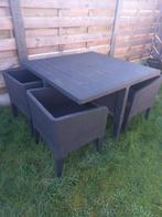 Tuinsetje kubus,in goede staat met kussens als nieuw (zitten nog in verpakking) afm;tafel 120×120×75 mag weg voor 65 euro,,, enkel afhalen, 9950 waarschoot