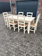 Landelijke tafel met 6 stoelen in uitstekende staat. De tafel is zeer stevig en heeft een lade en de afmetingen zijn 180cm lang , 90 cm breed en 80 vm hoog.