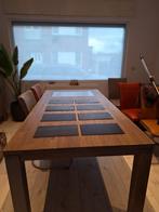 Mooie zware eiken eettafel uittrekbaar met blauwe steen inzet licht verhoogd ten opzicht van tafel. Dus niet 100 procent gelijk me