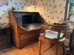 Fraaie antieke secretaire / klepbureau met stoel, een uitklapbaar schrijfblad waaronder drie grote laden. De laden zijn voorzien v