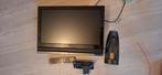 Oudere televisie met afstandsbediening en beugel om te bevestigen aan de muur. Het scherm is 21 inch (diagonaal) hoogte 37cm, breedte 54cm, dikte 8cm
