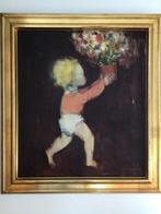 Charmant portrait d'un jeune enfant avec un pot de fleurs la toile et le magnifique cadre doré sont en très bon état (légers d