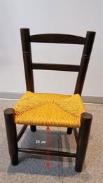 Volledig gerestaureerd houten kinderstoeltje met rieten zitting. Breedte vooraan: 28 cm, zithoogte: 22 cm, rugleuninghoogte: 47 cm