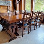 Vitrine kast is weg. Dus enkel lange commode kast, 6 stoelen 2 banken en tafel. Er zijn 2 extra verlengstukken bij voor de tafel.