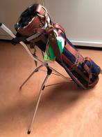 Sac de golf en toile bleue, avec bords et sangles en cuir, avec plusieurs pochettes avec rabats. Capuchon de protection assorti, d'origine pieds pliants intégrés. Etat impeccable.