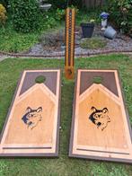 Zeer stevig mooi cornhole spel ideaal voor feestjes , bbq 's enz.. Zeer leuk en spannend spel voor 2 of 4 personen. Met 2 lagen jachtlak vernis . Met - 4 rode en 4 blauwe werpzakjes .keuze uit ega