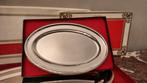 Plateau inox 11. Set de 2 plats de présentation en inox poli, poignées dorées, forme ovale : 21 x 32 cm haut. 4 Cm – prix : 15 €/le set 12. Grand plat de présentation letang remy, forme ovale (ne
