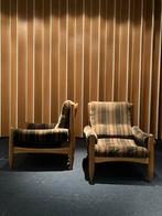 Twee vintage fauteuils - zetels, met eikenhouten frame. Kussens moeten eens afgestoft. De singels van de zitting moeten helaas vervangen worden. De kussen verkeren in geleefde staat maar kunnen nog ff