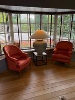 Oude volledig gerestaureerde zeteltjes met prachtig kwaliteitsvolle stoffering nieuwe vulling kussen kleur koraal rood-oranje fijne houten (eik) pootjes afmeting h 84 cm b 68 cm d 72 cm worden per 2 t