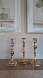Set van 3 massief messing kandelaars handgemaakt zijn reeds opgepoetst h 17cm leuk detail het zijn 3 verschillende