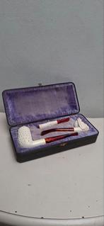 Cet ensemble se compose d'une pipe en écume de mer levent ornée d'une gravure détaillée, emballée dans une pochette assortie. Matériau : les tuyaux sont fabriqués en écume de mer, un minéral d
