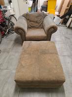 Mooie stoere éénzit te koop met bijhorende grote poef van 80 x 100 in buffelleer. Geen scheuren, heel proper.