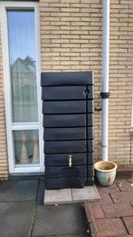 Zwarte muur regenton met een inhoud van 320 liter. Het is een rechthoekige ton, plat model. Door de rechthoekige vorm en de geringe diepte neemt deze grote regenton weinig ruimte in, ideaal voor in ee