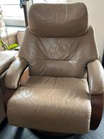 Zeer mooie en goed onderhouden relax fauteuil in taupe leder met voetbankje in zelfde taupe leder. Zeer zacht en comfortabel leder, brede aangename zit. Regelbare rug.