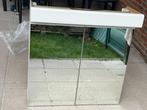 Meuble de salle de bain blanc. Largeur 80 cm, hauteur 81 cm, profondeur pour étagères 22 cm et profondeur avec éclairage 32 cm. Comprend 2 étagères en verre.
